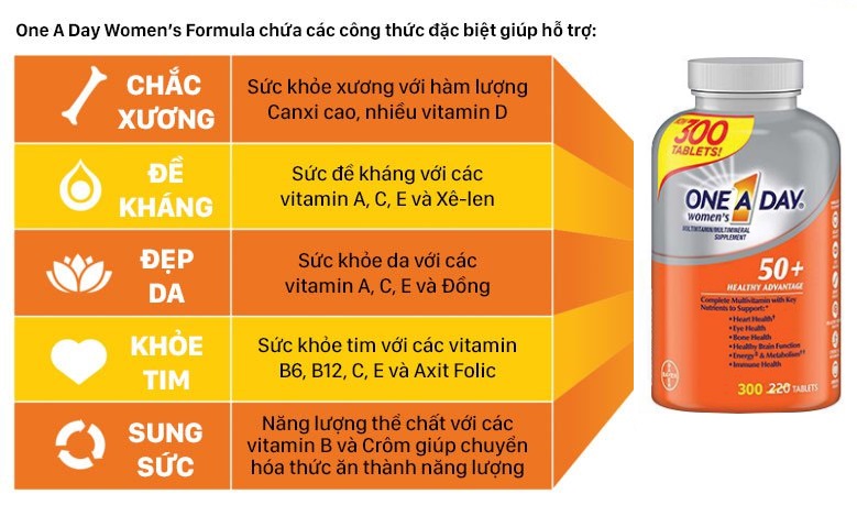 - One A Day Women 50+ là sản phẩm đang được bán chạy trên thị trường quốc tế và trong nước. Sản phẩm đã được kiểm duyệt chất lượng và độ an toàn vệ sinh cao từ bộ y tế Hoa Kỳ. Ngày nay, sản phẩm đang được đông đảo chị em tin dùng để cải thiện cơ thể phát triển hơn.